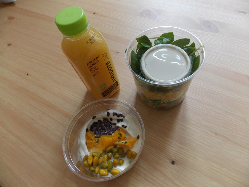 Wenn man wirklich das ganze Menü schafft zu essen/ trinken, dann hat man insgesamt ca. 1.200 kcal zu sich genommen, was für ein Mittagessen wirklich sehr viel ist! Mein persönlicher Kalorienbedarf, um nicht zuzunehmen, liegt bei ca. 2.020 kcal/ pro Tag. D.h. ich hätte nach dem Menü bereits über die Hälfte meines Tagesbedarfs abgedeckt. Aber wenn man sich das Menü tagsüber einteilt und z.B. den Yoghurt zum Frühstück isst, den Salat zum Mittag und am Abend ein gesundes Gericht nach Wahl, dann liegt es vollkommen im Rahmen. Und ganz wichtig: Es handelt sich bei diesem Menü um gesunde und natürliche Zutaten. Keine Nudeln, fettige Pizza oder Döner… was die meisten dann doch mal schnell bestellen oder?!