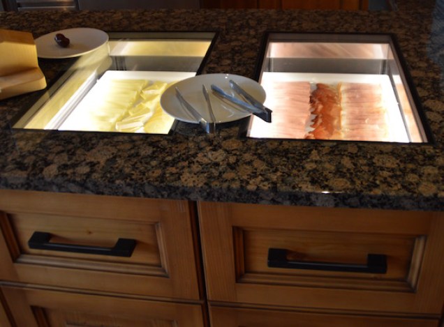 Ein Hingucker sind auch hier die gekühlten Schubladen mit der Käse- und Wurstauswahl. Am Tisch liegt das tägliche Programm inkl. Menü am Abend, Wetterbericht und besonderen Ausflugstipps oder Angeboten.