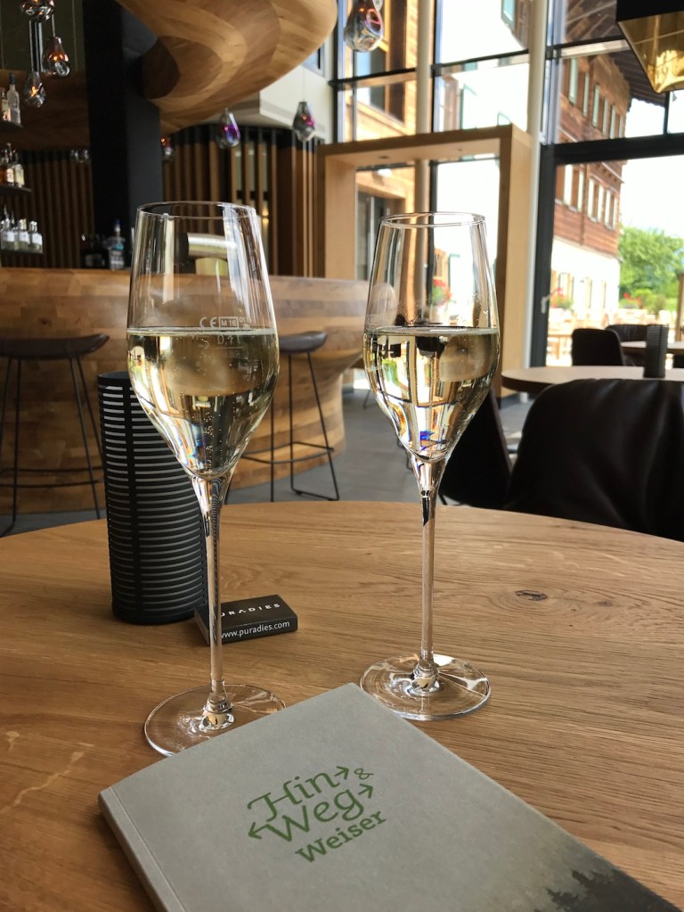 Unser Zimmer war auch schon fertig, so dass wir uns gleich auf Erkundungstour begeben konnten. Wir hatten eine Deluxe Suite im separaten „Traumquartier“ im 2. OG. Die Häuser sind mit einem unterirdischen Gang verbunden. Wir haben zwar meistens die Treppe genutzt, aber die Sicht auf die Steinberge im Glasaufzug ist sehenswert. Alle Zimmer haben einen Balkon und dank des Hochplateaus auch einen herrlichen Bergblick, entweder auf die Steinberge oder auf die Grasberge rundherum. Unser Doppelzimmer war mit 35 m2 sehr geräumig, bot sehr viel Ablagefläche und war mit allem ausgestattet, was man so benötigt. Auch hier wird viel Wert auf natürliche Materialen gelegt. Auf dem großzügigen Balkon stehen zwei einladende Holzstühle zum Relaxen bereit.