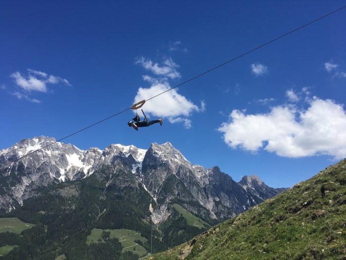 In der Sommersaison ist bei jeder Hotelübernachtung in Leogang die Löwen Alpin Card inklusive. Ein Highlight der Karte: sie beinhaltet eine freie Berg- und Talfahrt mit der Asitz Kabinenbahn bzw. Steinbergbahn in Leogang oder den Bergbahnen Saalbach Hinterglemm. Wir sind mit der Asitz-Bahn bis ganz nach oben gefahren. Ein kurzer Abstecher zur stylischen Hendl-Fischerei ist ein Muss. Leider hat sie nur in der Wintersaison geöffnet. Aber auch so ist sie ein Augenschmaus und die herrliche Aussicht kann man auch so genießen. Zurück zur Mittelstation, vorbei am Flying Fox