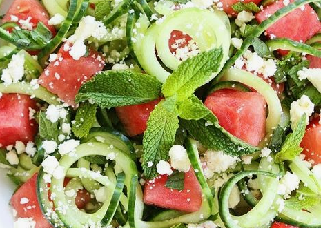 Dieser Salat vereint einfach alles, was man im Sommer so braucht. Knackige Gurkenspaghetti gepaart mit der sommerlichen Süße der Wassermelone.