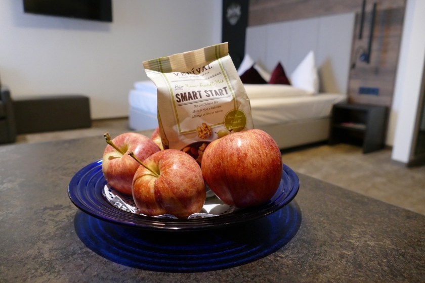 Zur Begrüßung stand auf dem Tisch eine Flasche Mineralwasser, Äpfel und eine Packung mit verschiedenen Nüssen. Das i-Tüpfelchen wäre hier noch eine kleine persönliche Begrüßung und sei es nur ein kleine Karte mit „Herzlichen Willkommen Familie Moser – schön, dass Sie bei uns sind. Genießen Sie die Tage im Hotel Riml“.