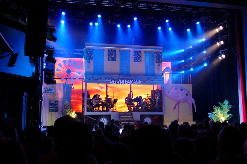 Das alles findet auf der Bühne in einer Art „Multifunktions-LKW statt ,auf dem auch die Musiker ihr bestens geben. Der LKW wird umgebaut in eine Bar, ein Flugzeug, ein Hotel , .. klasse Ideen und tricky umgesetzt.