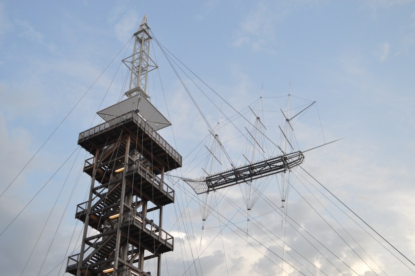welches mit Drahtseilen fest vertaut am Höhenrausch-Turm befestigt ist #amDachvorAnker, die überdimensionale, menschliche Figur
