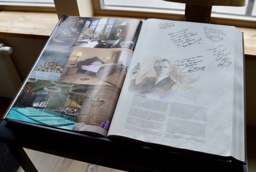 Vor der sog. „Bond-Suite“im 4. Stock erinnern heute Bond-Plakate und eine Info-Tafel an den besonderen Gast.Und dass es auch der Filmcrew im Hotel Bergland sehr gut gefallen hat, kann man dem Gästebuch im Barbereich entnehmen.