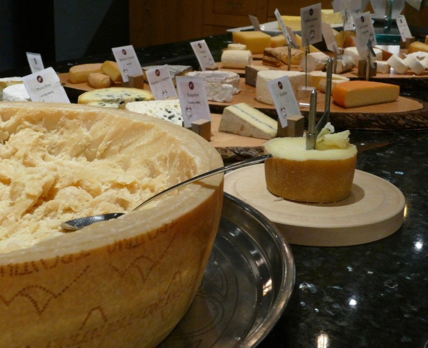 Salate und Käse holt man sich am Büffet, alle anderen Menügänge werden serviert bzw. beim Dessertbuffet auch an der offenen Kochstation frisch zubereitet.