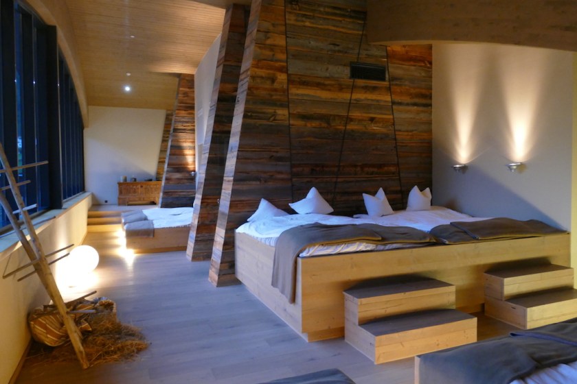 Besonders schön gelungen ist auch der „Raum der Stille“.Das alte Holz und die indirekte Beleuchtung zaubern zusammen mit den Heubettenein ganz besonderes Wohlfühlambiente. Dazu der einzigartige Duft und die Aussicht, zauberhaft.