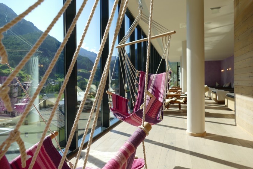 Hier über den Dächern von Sölden lässt es sich traumhaft in den Hängestühlen chillenund das wunderbare Panorama genießen.