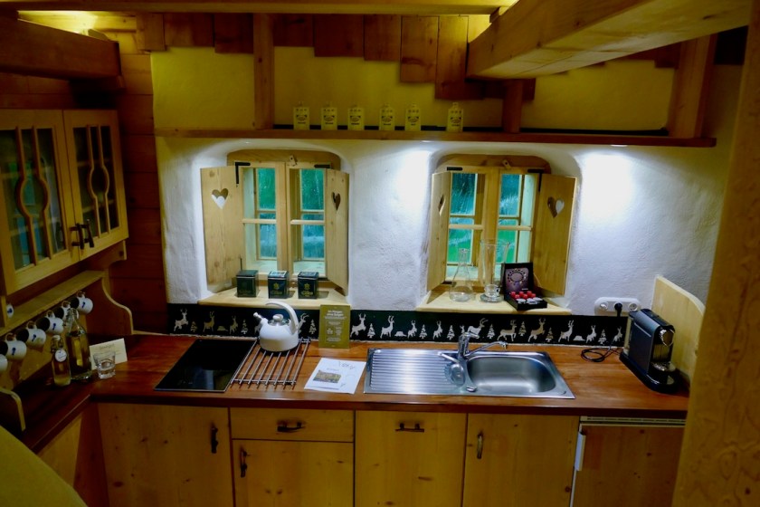 Die urige Oma-Küche ist mit Geschirrspüler, Kühlschrank, Cerankochfeld und Kapsel-Kaffeemaschine ausgestattet. Es gibt eine Fussbodenheizung in den beiden Bädern und einen begehbaren Kleiderschrank neben dem Schlafzimmer. Die Vollholzbetten sind super bequem. Die beiden Flatscreens sind dezent hinter Holz versteckt und kostenloses WLAN hat man im gesamten Almdorf.