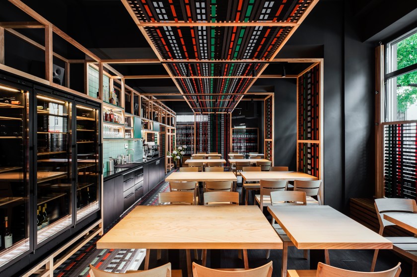 überzeugt wie die Küche durch japanische Klarheit und bunte, lateinamerikanische Farbpracht. Die Einrichtung gestaltete Felix Pahnke, der mit seinem Design aus hellem Eschenholz und geflochtenen Bändern die Eigenarten der so unterschiedlichen Kulturen in den Gastraum übersetzt hat.
