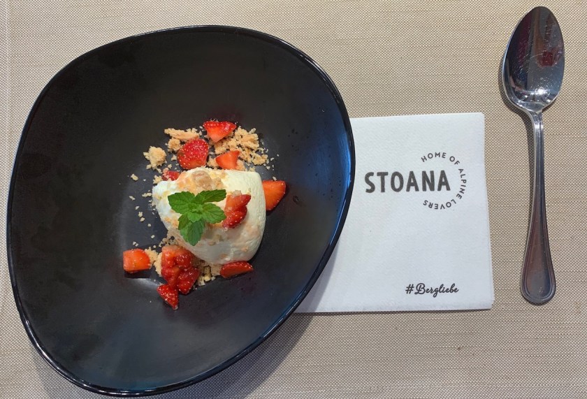 Auch unser Hotel bezieht von dort den Ziegen-Frischkäse. Und schon schließt sich wieder der Kreis. Wir sind beim Thema Essen. Als Tagesbericht gab es heute im STOANA Gemischten Salat mit Feta und Oliven, Karotten-Ingwer-Suppe oder Pfifferling-Knödel. Viele Gäste lassen sich die Schmankerl ins Appartment bringen. Wir haben als einzige Gäste den liebenswerten und sehr aufmerksamen Service unten im modernen Speisesaal genossen.