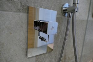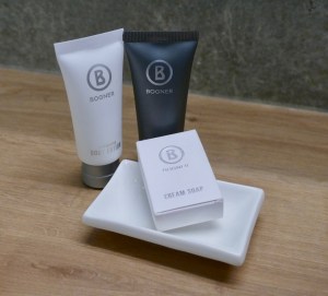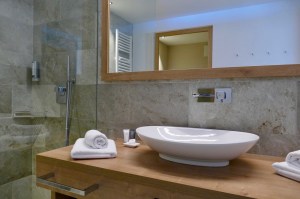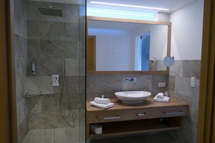 Offenes Badezimmer mit Regen-Dusche, getrenntem WC und Bidet, Föhn und Kosmetikartikeln von Bogner. Auch hier ist das markante Logo perfekt integriert.
