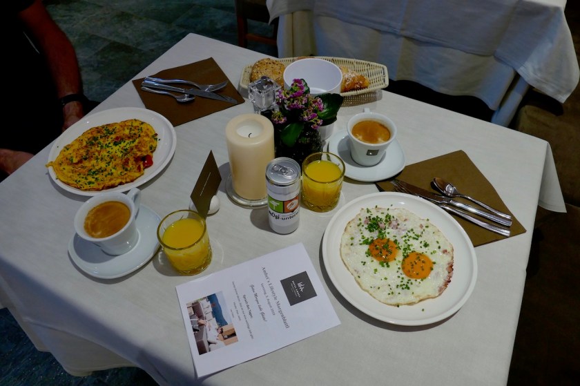 Die Eierspeisen und Pfannkuchen werden frisch an der offenen Kochstation zubereitet. Alles andere, wie Brot, Semmeln, Wurts, Käse, Obst, Joghurt, Croissant, Marmeladen, Bauernbutter und Aufstriche holt man sich am Buffet. Für die Heißgetränke steht ein Automat zur Verfügung. Man kann sich auch seinen Gemüsesaft selbst zubereiten oder einen frischen Smoothie probieren.