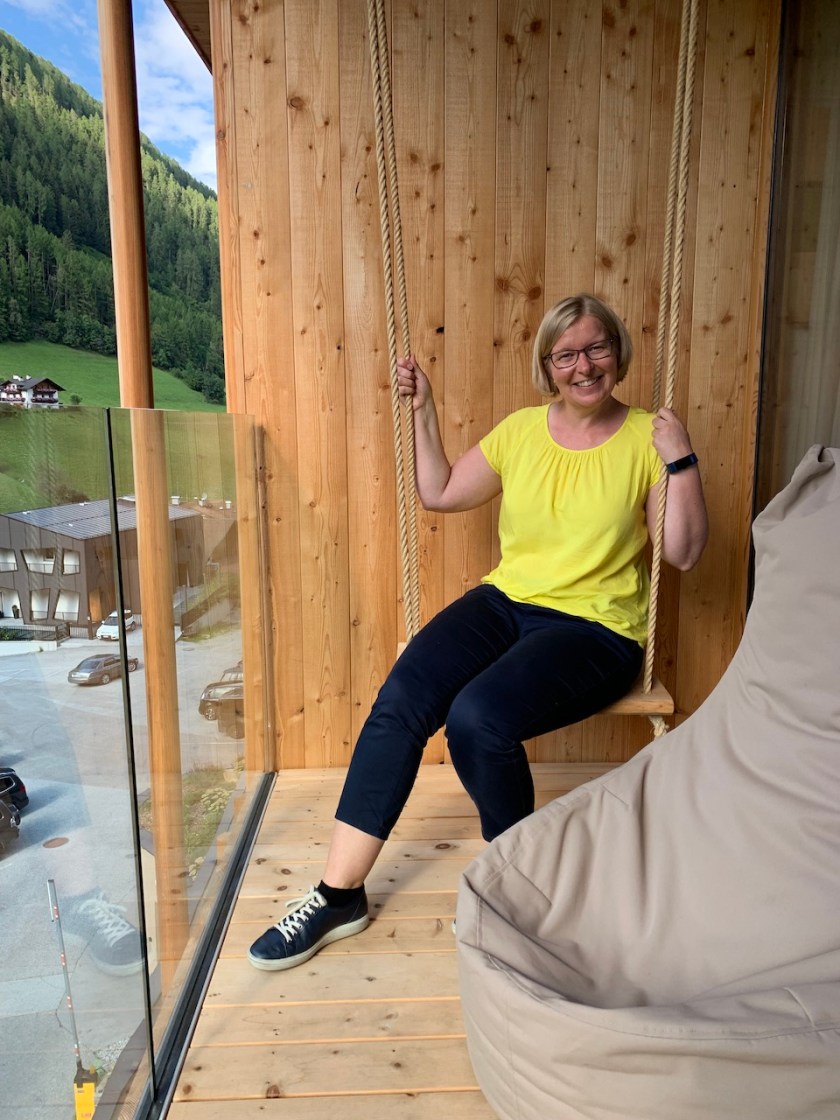 Zu meinem persönlichen Lieblingsplatz ist sofort die handgefertigte “Loslasser Zirben-Schaukel” geworden, die es auch im hauseigenen Natur-Shop “Naturado” zu kaufen gibt. Das aktive, bewegte Sitzen soll in vielerlei Hinsicht deutlich besser sein als eine starre Sitzposition. Kann ich nur bestätigen. Hier auf der Schaukel sitzen und dazu dieser Blick raus in die Natur, mehr braucht es gar nicht.
