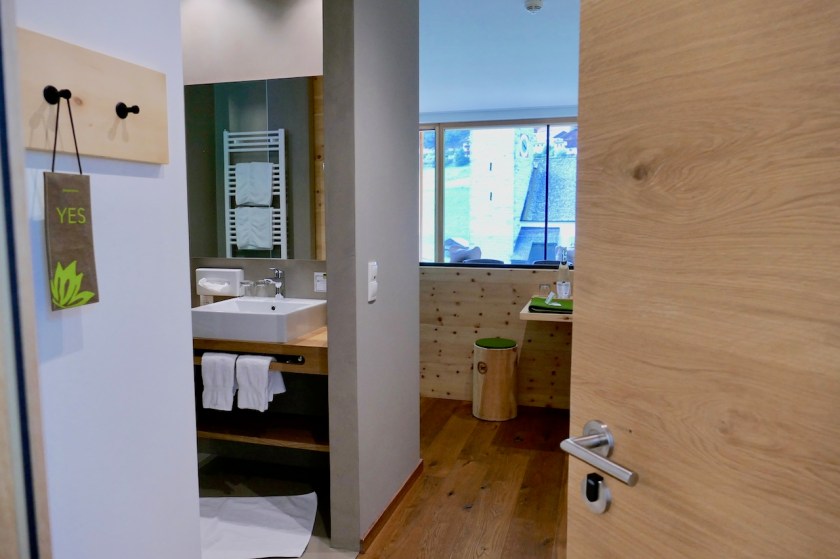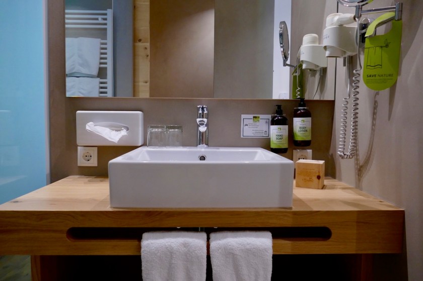 Auch im Bad wird viel Wert auf Nachhaltigkeit gelegt, große nachfühlbare Flaschen mit Naturkosmetik, der Hinweis auf Mülltrennung, Wassersparen und Handtuchwechsel bei Bedarf.