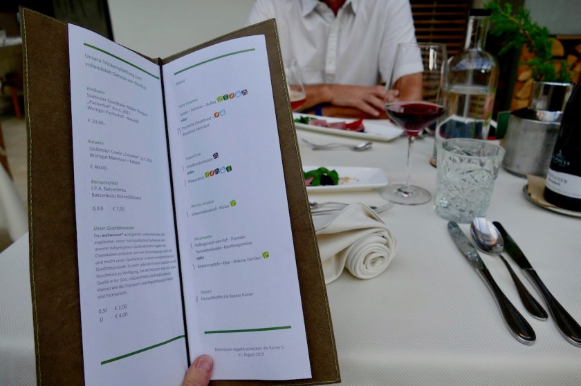 Neben vielen Südtiroler Weinen, gibt es auch jeden Abend eine Getränkeempfehlung. Dabei war auch das Bier “Wuida Hund”. An der Bar haben wir später den selbstgemachten Zirbenlikör vom Senior-Chef und einen Zirbenschnaps probiert.