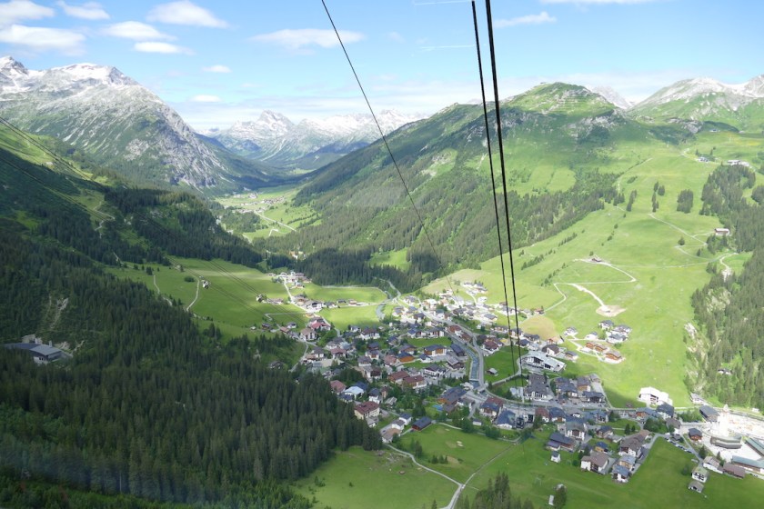 Der Blick aus der Rüfikopf-Bergbahn auf das traumhaft eingebettete Lech, umringt von einer imposanten Bergwelt.