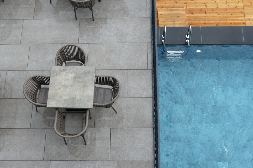 Blick vom Balkon runter auf den verlockenden Außenpool und den Gartenbereich. Fehlt nur noch die Sonne.