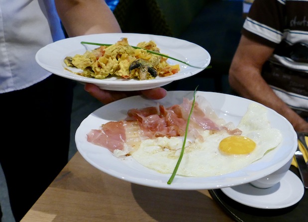 Die Auswahl ist sehr reichhaltig. Sogar das Rührei wird mit gebratenem Speck im Glas serviert, dazu Müsli, frisches Obst, …