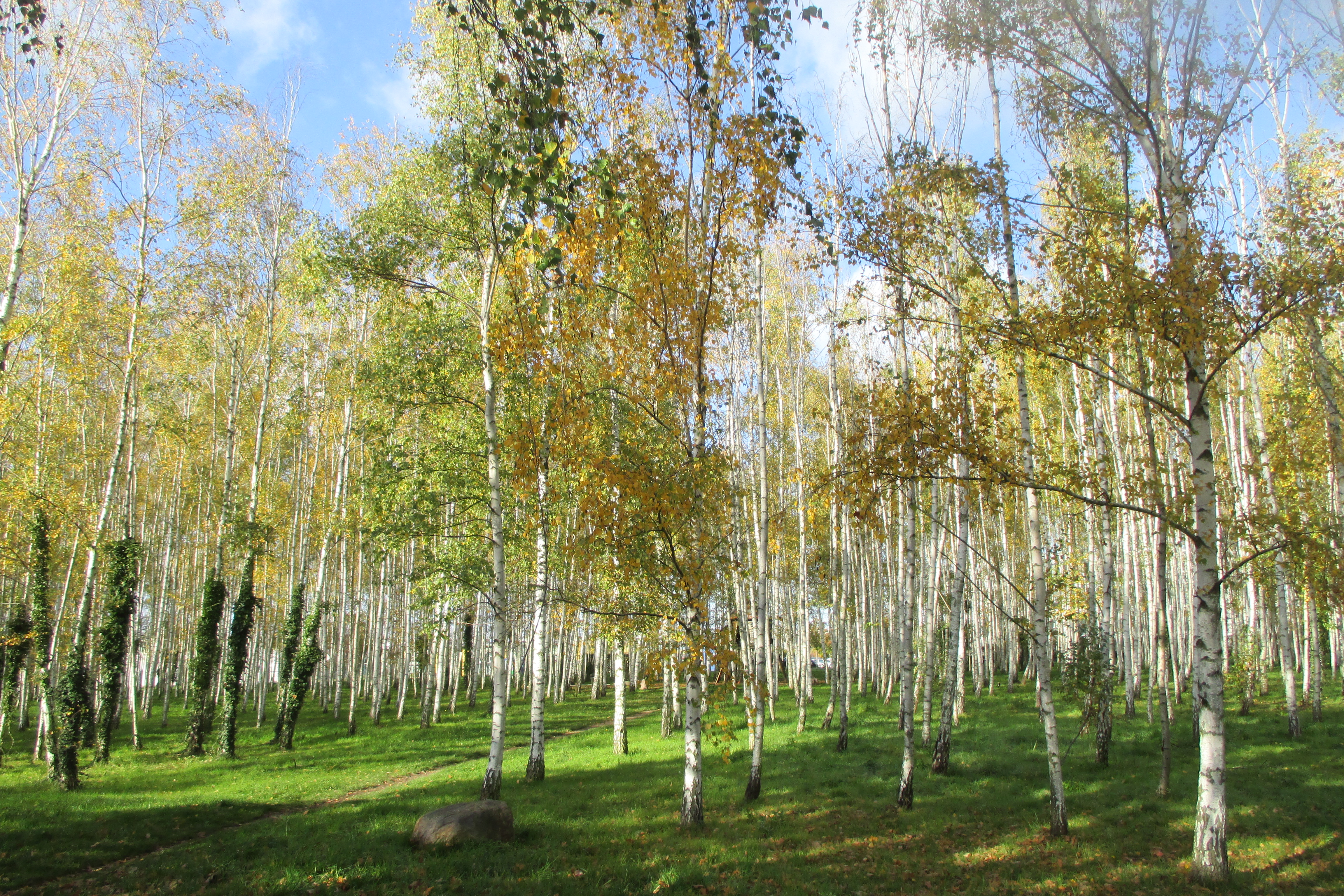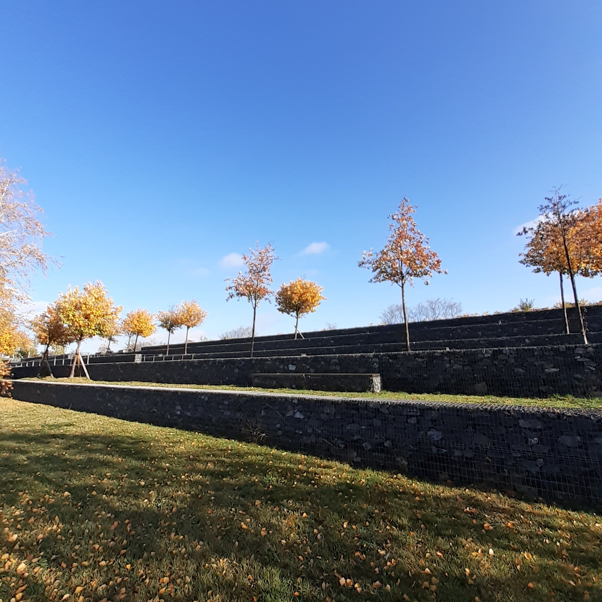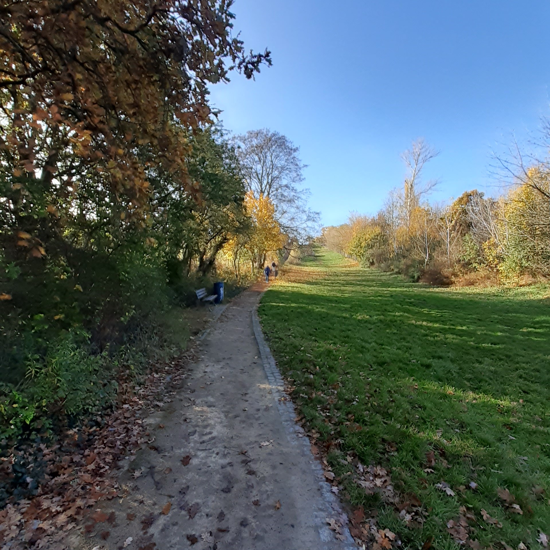 Beim Verlassen des Falkenbergs fällt uns ein (für eine Einrichtung dieser Art) recht nett anzuschauendes Krankenhaus auf, namentlich Hedwigshöhe – auch das war mir bisher kein Begriff. Es wirbt mit dem Slogan „Beliebtestes Krankenhaus in Berlin“ und ohne hierfür weitere Recherche zu betreiben, passt dieses Eigenlob zumindest optisch auf den ersten Blick. Weiter geht es über die Straßen Höhensteig, Zur Gartenstadt, Grottewitzstraße, Kirchsteig, Bohnsdorfer Kirchsteig links in die Paradiesstraße und rechts in die Buntzelstraße bis zur Autobahnunterführung. Dahinter an der Dorfkirche und dem Anger von Bohnsdorf vorbei und über die Grünbergallee zur B 96 und zum S-Bahnhof Grünbergallee. Wir überqueren die Gleise und ziehen weiter durch eher unauffälliges Wohngebiet und kreuzen die Schönefelder Chaussee. Nun folgt ein völliger Kontrast zu den eben passierten Plattenbauten: Eine große Parkanlage mit Teich, Gras- und Wiesenlandschaft erwartet uns hier – die Sonne scheint, die Bäume tragen ihr Blattwerk in den schönsten Herbstfarben und nun treffen wir auch wieder auf einige Spaziergänger, Jogger und vereinzelte Wanderer. Wir befinden uns nämlich im Landschaftspark Rudow/Altglienicke.