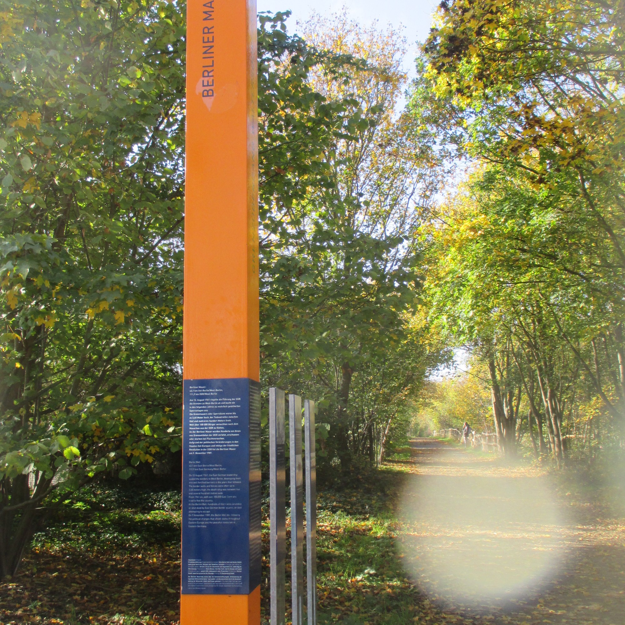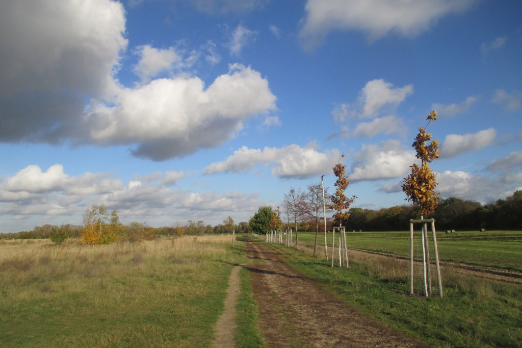 Auch hier geht es vorbei an Wasserbüffeln. Als ich die Infotafeln am Rand des Weges betrachte, wird mir klar, dass wir uns auf dem ehemaligen Postenweg der DDR Grenztruppen, dem heutigen Berliner Mauerweg, befinden. Es gibt allerlei Geschichtliches zu lesen: Vor allem die vielen Einzelschicksale, der mindestens 136 Menschen, die zwischen 1961 und 1989 an der Berliner Mauer getötet oder in unmittelbarem Zusammenhang mit dem DDR-Grenzregime ums Leben kamen, lassen mich erschaudern. Nur ungern ziehe ich weiter. Aber bei einer derart langen Wanderung im Herbst, wo die Sonne bereits um halb fünf untergeht, sitzt eben auch immer die Zeit ein wenig im Nacken.