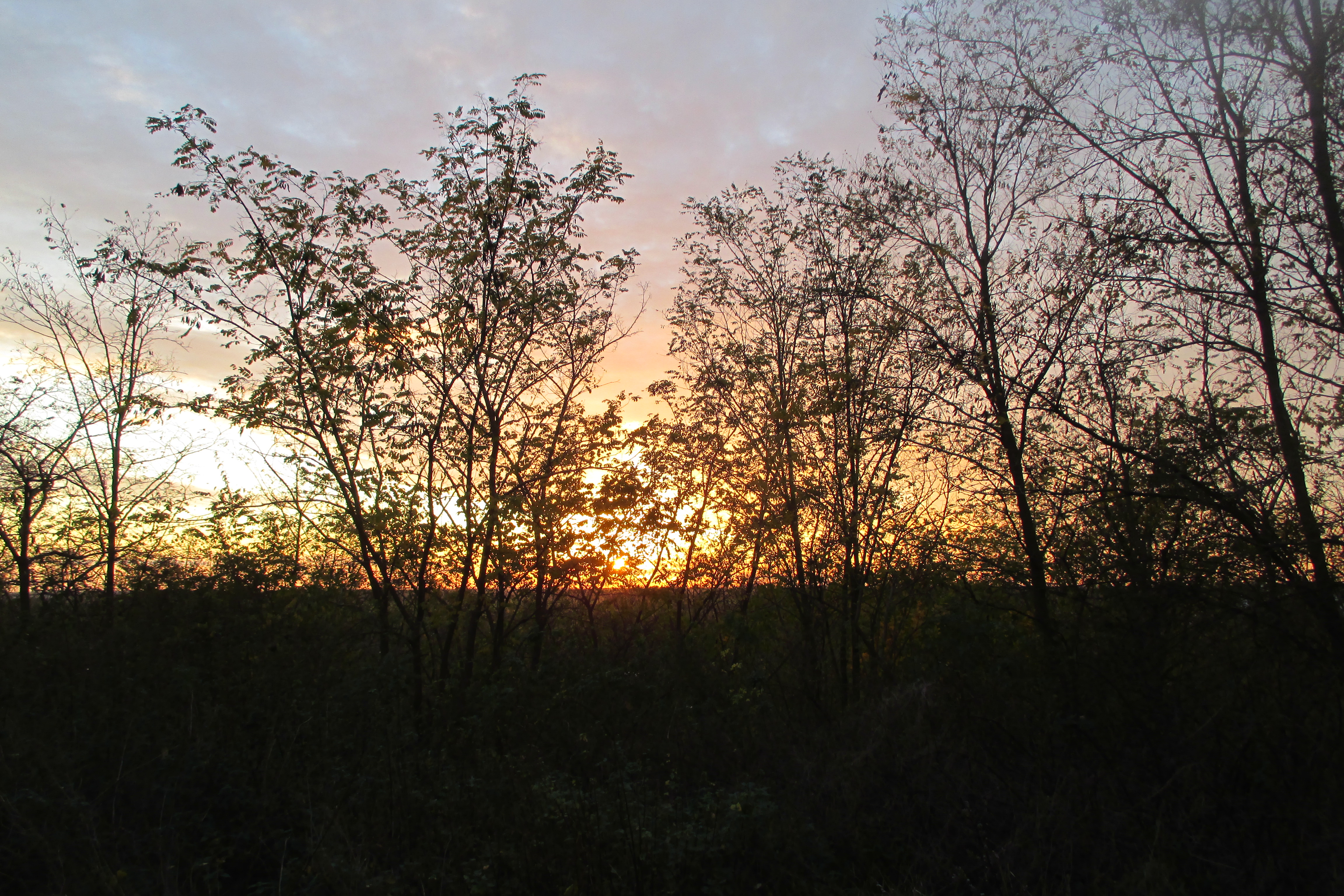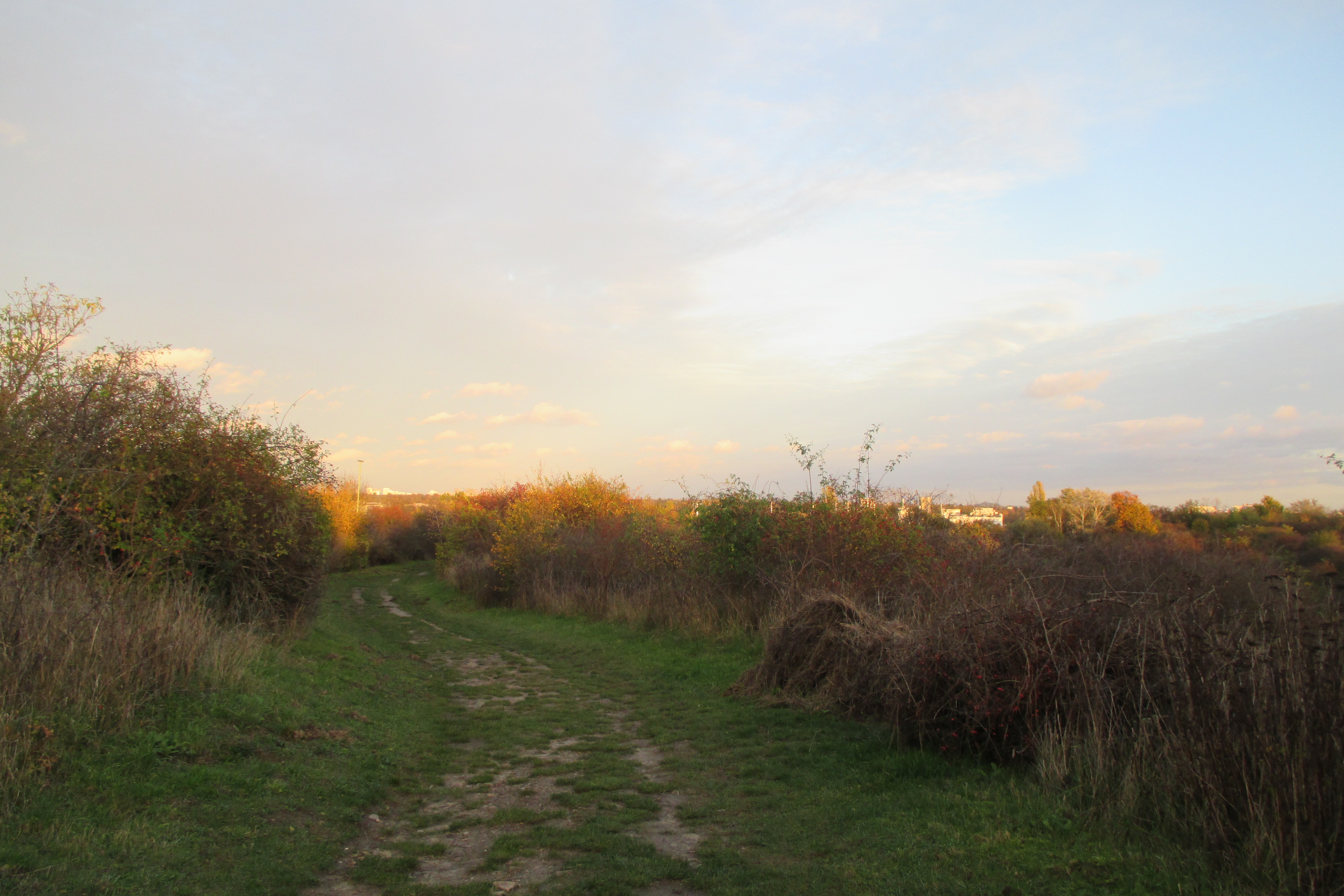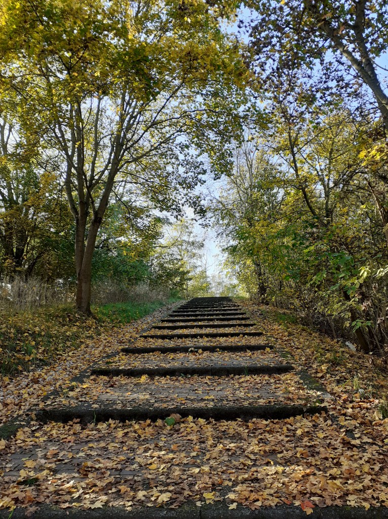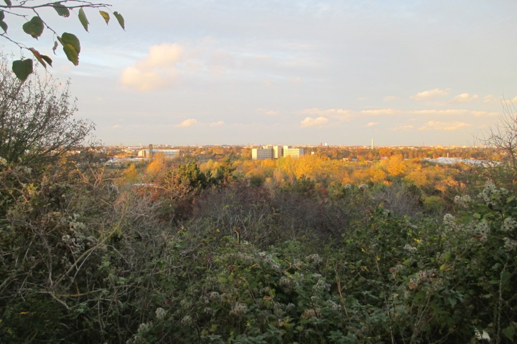 Abermals geht es durch ein Waldstück, dann erreichen wir den Freizeitpark Marienfelde. An einem Gittertor laufen wir links hindurch und erklimmen den auf 76,7 Metern gelegenen Alpengipfel mit seiner kleinen Aussichtsplattform. Die ist allerdings besetzt, denn hier haben sich Unmengen an Zweiergrüppchen versammelt, die mit Bier oder Picknickkörben in der Hand auf den Sonnenuntergang warten. Doch auch ohne den halben Meter höher auf die Plattform zu steigen, erhaschen wir einen wirklich hübschen Panoramastadtblick, der vor allem deshalb entzückt, weil das davor liegende Dickicht in allen Herbstfarben leuchtet. Lange verbleiben wir allerdings nicht, sondern steigen über den Wechselkrötenteich hinab und laufen über den Diedersdorfer Weg hinweg bis zum Gipfel des Schlehenberg. Der soll auf 64 Metern liegen, doch irgendwie führt kein Weg hinauf. Als wir ihn schließlich doch gefunden haben, stellt sich heraus, dass er so vom Dickicht zugewachsen ist, dass kaum was zu sehen ist. Als lohnenswerter stellt sich viel mehr der Abstieg mit Blick auf die Wohnsiedlung heraus – auch weil der Sonnenuntergang mitspielt, bis wir die Marienfelder Allee erreichen.
