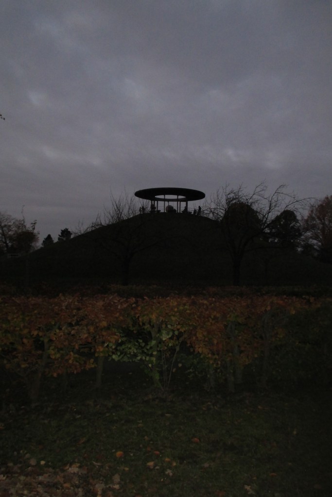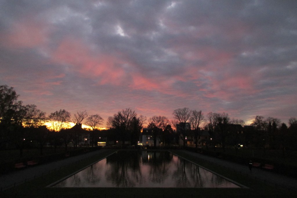 Nun ist die Sonne vollends untergegangen und wir marschieren auf einem recht hübschen Grünzug, namentlich Teltower Dörferweg, zum Lilienthalpark, mit dem auf 59,4 Metern gelegenen Fliegeberg. Der Berg wurde 1894 von Otto Lilienthal persönlich angelegt, der ihn als Startpunkt für zahllose Flugversuche mit seinen Fluggeräten nutzte. Mittlerweile ist es duster, aber die Lichter im Park lassen uns einen hübschen Rundumblick genießen. Im Übrigen sind wir nicht die einzigen: Horden Jugendlicher hocken auf dem Rondell des Fliegeberg – rauchend, Selfie-schießend – und zwei durchaus ambitionierte Damen flitzen die Treppen der Anhöhe, ihr Workout ausführend, immer wieder auf und ab. Wir saugen den Blick auf, dann geht es wieder runter und im Katzensprung geradeaus auf der Réaumurstraße zum S-Bahnhof Lichterfelde Süd.