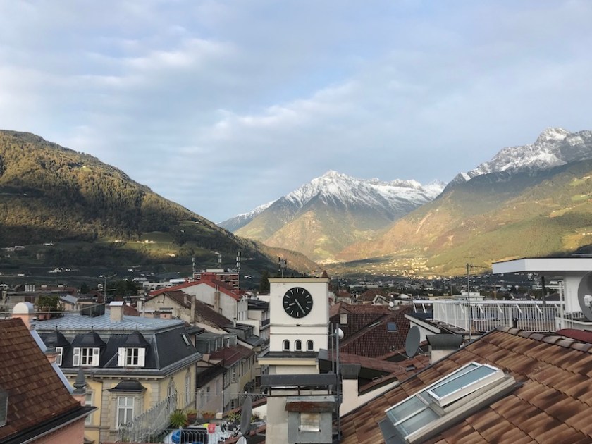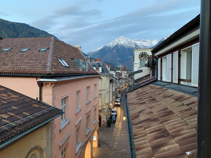 Sowohl von unserem Zimmer aus, als auch von der Dachterrasse, haben wir einen phantastischen Blick auf die Laubengasse und die umliegenden Schneeberge.