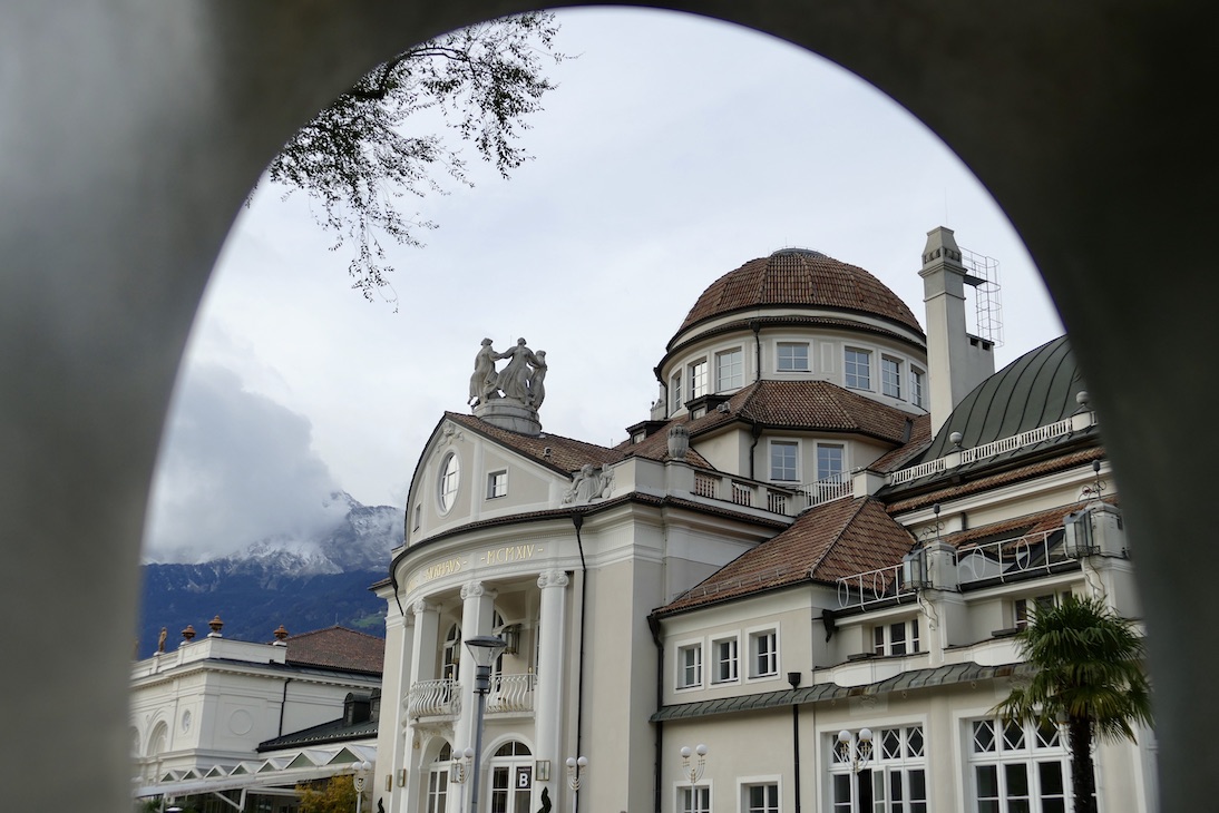 Für uns geht es über die Postbrücke wieder zurück auf die andere Seite. An der Kurpromenade weiter, vorbei am Meraner Kurhaus und dem Schriftzug „merano“