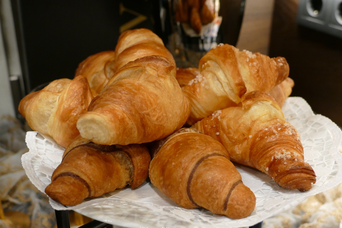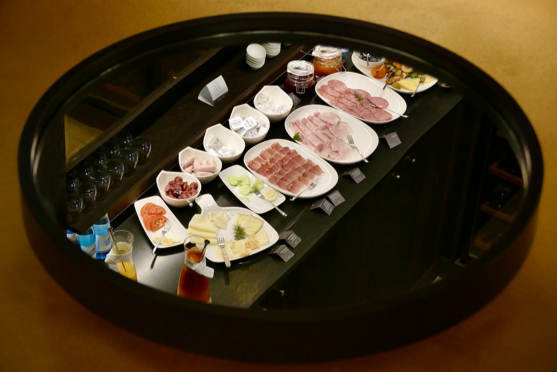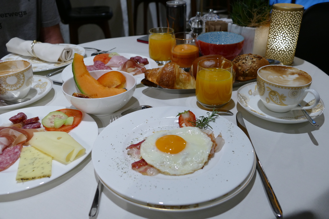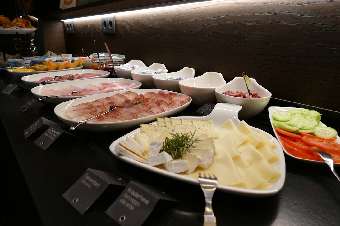 Wir bedienen uns am reichhaltigen Buffet. Eierspeisen werden frisch zubereitet und an den Tisch serviert. Super lecker ist der frischgepresste Orangensaft, die verführerischen Croissant mit verschiedenen Füllungen und natürlich der typische Südtiroler Speck.