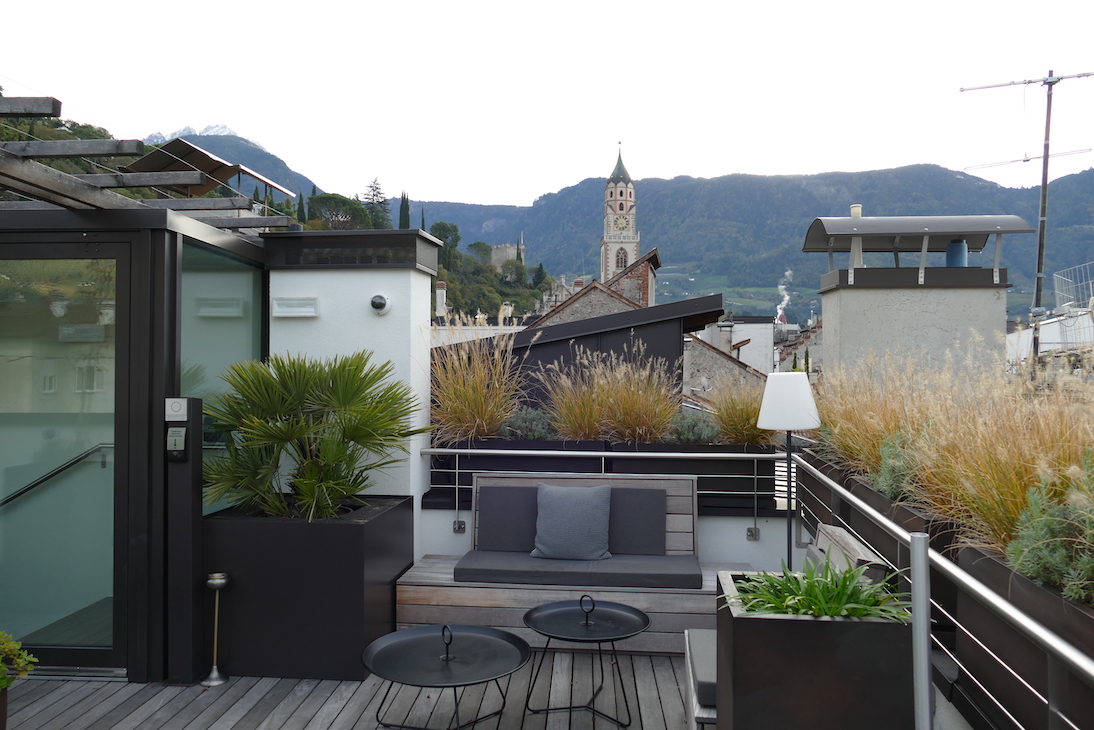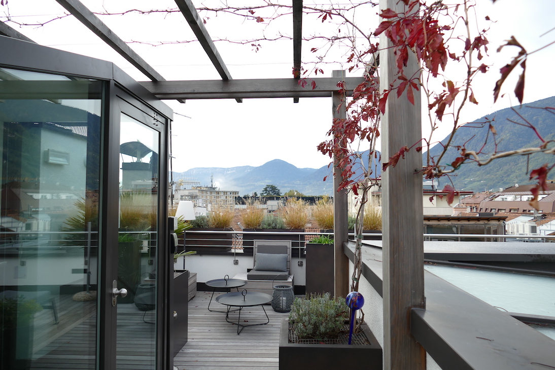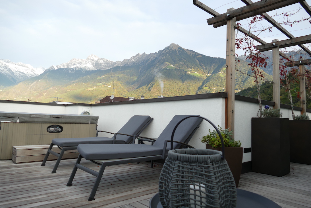 Auf der Dachterrasse kann man genüsslich im Whirlpool chillen oder auf den Liegen und der Lounge die 360 Grad-Aussicht über Meran genießen. Mehr mittendrin geht nicht.