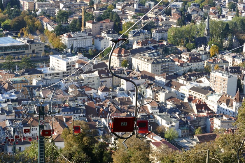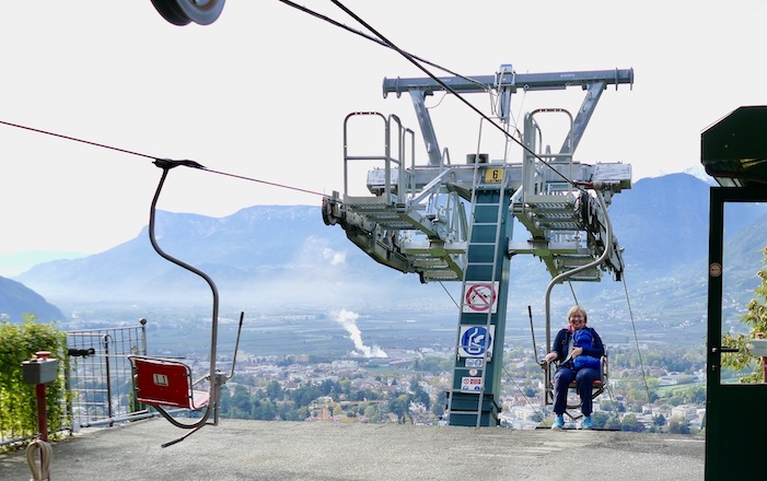 Los gehts mit einer nostalgischen Fahrt mit dem Einer-Sessellift von der Meraner Altstadt in wenigen Minuten rauf auf den Küchelberg, 170 Höhenmeter über Meran. Die einfache Fahrt kostet mit Kurkarte 4,50 Euro, Hin-und Rückfahrt 5,50 Euro. Der Lift ist durchgängig von 9 bis 18 Uhr im Betrieb, im Sommer sogar 1 Stunde länger.