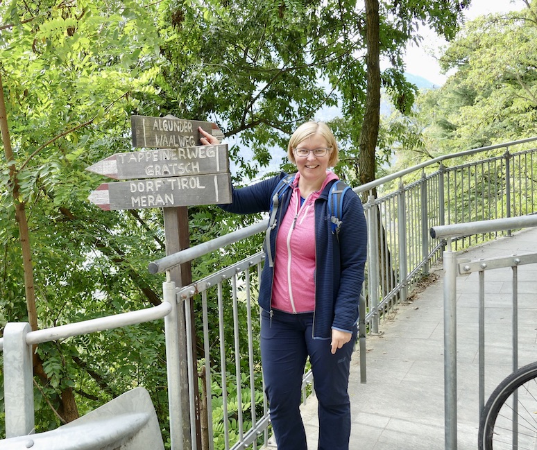 Der Algunder Waalweg gehört zu den schönsten Panoramawanderwegen im Meraner Land. Der komplette Algunder Waalweg hat gut 6 km und verläuft von Ober- und Mitterplars über Algung bis Gratsch. Wir laufen hier jedoch nur das kurze Endstück bis zur Hängebrücke. Ein kleines Stück an der Strasse entlang, dann beginnt der berühmte Tappeinerweg.