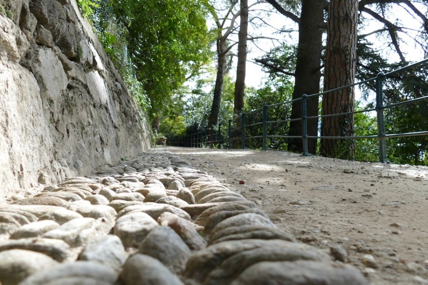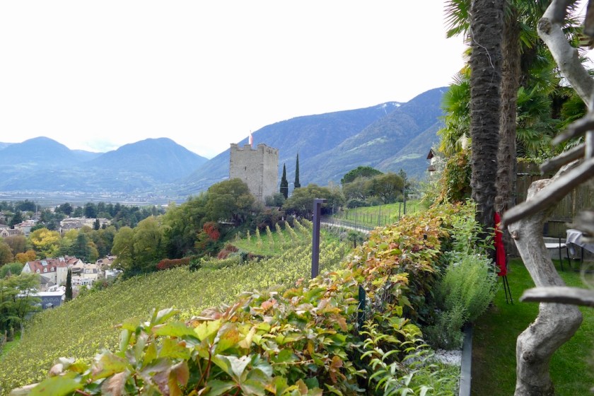 Wir folgen dem Weg aber oberhalb des Stadtzentrums noch weiter am Kräutergarten und am Kirchturm, dem meistfotografiertesten Meranblick, vorbei bis zum Zenoberg, wo der Tappeinerweg am Pulverturm endet.
