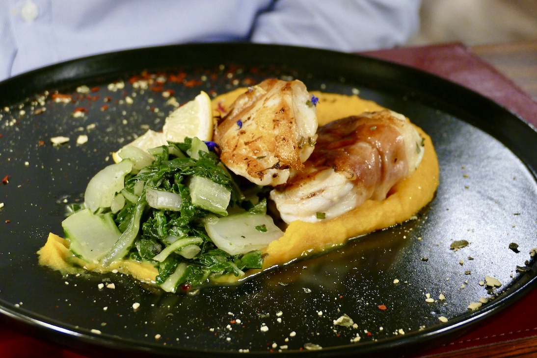 Typische Tiroler Gerichte gepaart mit italienischen Spezialitäten. Wir hatten z.B. Hirschcarpaccio auf Rucola mit marinierten Pfifferlingen und Holunderbeere-Vinaigrette und Tiroler Seeteufel Saltimbocca auf Kürbispüree und Mangold.