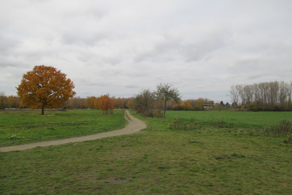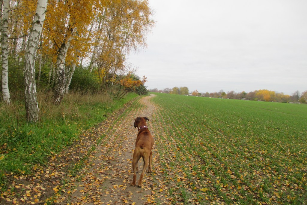 Wir ziehen unterdessen über einen Feldweg weiter zum Stadtrandpark Neue Wiesen, treffen auf einige Gassigeher mit ihren Hunden. Goldbraunes Laub liegt auf dem Boden, die Bäume sind mittlerweile ziemlich kahl. Schließlich erreichen wir die kleine Erhebung Teichberg auf 62,8 Metern Höhe. Weiter geht es durch den Landschaftspark Wartenberger Feldmark, es folgt eine schlichte Wohnsiedlung, dann erreichen wir die Kleingartenanlage Falkenhöhe-Nord e.V., die sich auf der Infotafel rühmt „schönste Kleingartenanlage Berlins 2004“ gewesen zu sein. Überhaupt ist mir auf dieser siebtägigen Rundwanderung um Berlin bewusst geworden, wie unendlich viele – etwa 70.000 – und vor allem auch schöne Kleingärten unsere Stadt zu bieten hat. Verteilt sind diese im Übrigen in mehr als 700 Anlagen über das gesamte Stadtgebiet – und ja: Berlin ist auch Hauptstadt der Kleingärtner. Allerdings ist auch das Interesse nach den Parzellen ziemlich hoch – die Wartezeit beträgt mehrere Jahre!