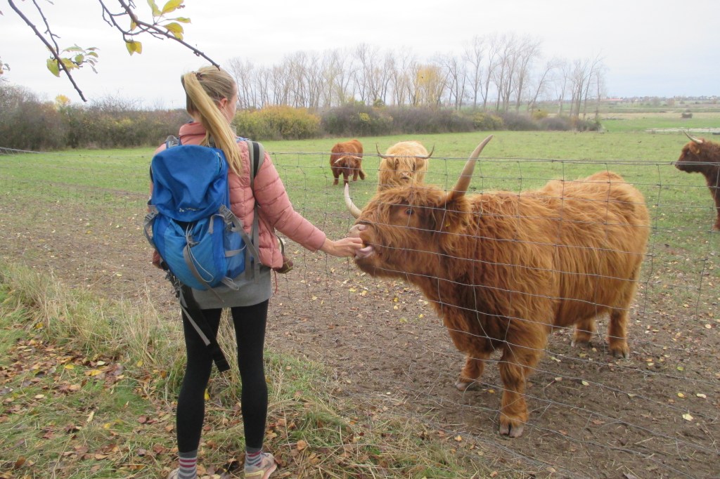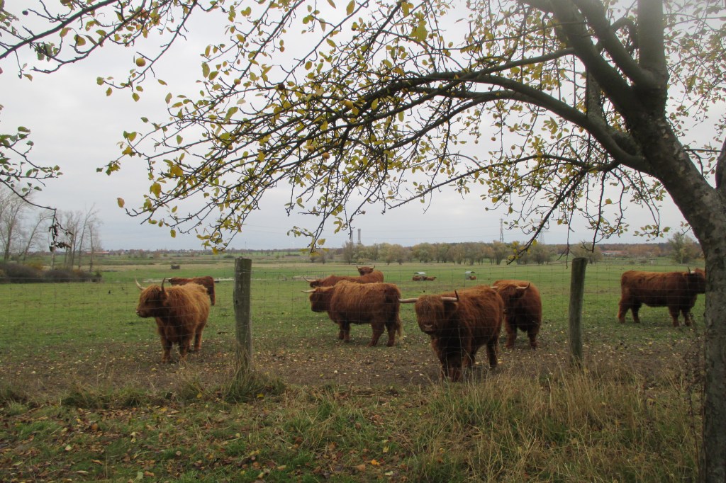 Wir laufen durch das Insektenviertel der Kleingartenanlage hindurch – vom Ameisenweg bis zur Hummelgasse, marschieren über einen weiteren Feldweg, dann erreichen wir die Falkenberger Rieselfelder. Mein Blick fällt auf eine große Weide, auf der schottische Hochlandrinder grasen. Eine der ältesten europäischen Rinderrassen, die aus den Hochlandmooren Nordschottlands stammt und durch ihre optimale Anpassung an raue klimatische Verhältnisse und karge Vegetation als besonders robust gilt. Ein prächtiger, zottelig rotbrauner Bulle mit waagerecht nach vorn gebogenen Hörnern steht am Zaun und glotzt uns an. Ich fühle mich in Kindheitstage zurück versetzt und flitze schnurstracks zum Zaun. Direkt neben der Weide steht ein Apfelbaum mit Fallobst und ich füttere den Bullen mit einem kleinen Apfel. Seine raue Zunge schnellt hervor und mein Mini quiekt im Tragetuch vor Vergnügen. Das Zotteltier schmatzt.