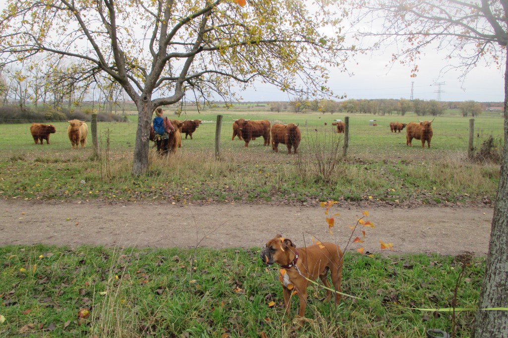 Wir rasten am Wegesrand, beobachten das Rindvieh noch ein bisschen. Auffallen tun uns die vielen Gassigeher. Aus der Ferne dringt lautes Bellen rüber. Viel Gebell. Da wird mir klar, dass eines der größten Tierheime Europas ums Eck ist. Im Ortsteil Falkenberg des Bezirks Lichtenberg gelegen, befindet sich das Tierheim Berlin, aus dem im Übrigen auch mein Hund stammt. Die vielen Gassigeher sind Freiwillige oder Paten der Tiere. Als hätte nun auch mein Hund begriffen, wo wir uns befinden, will er plötzlich nur noch weg. Der berühmte sechste Sinn? Ich werfe noch mal einen Blick zum Highland-Cattle und sehe, wie ein älterer Herr die Rinder füttert. Auch er versucht den Leitbullen auszutricksen, möchte das restliche Vieh versorgen. Dennoch: Der Chef sahnt ab. „An apple a day keeps the doctor away“ (Ein Apfel am Tag vertreibt Krankheit und Plag) wird hier wohl nicht zum Motto. Nun frage ich mich doch: Wenn jeder Spaziergänger auch nur einen Apfel an Big Boss verfüttert, kommt dann am Ende des Tages nicht so einiges zusammen? Hoffen wir also mal, dass der zottelige Leitbulle mit einem Bauchgrummeln davon kommt …