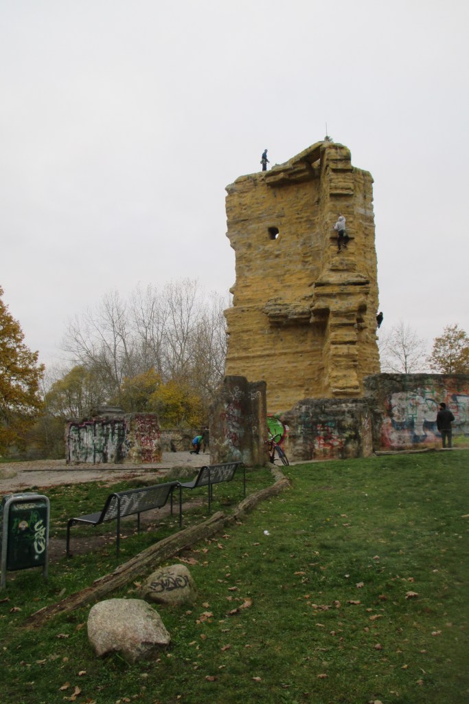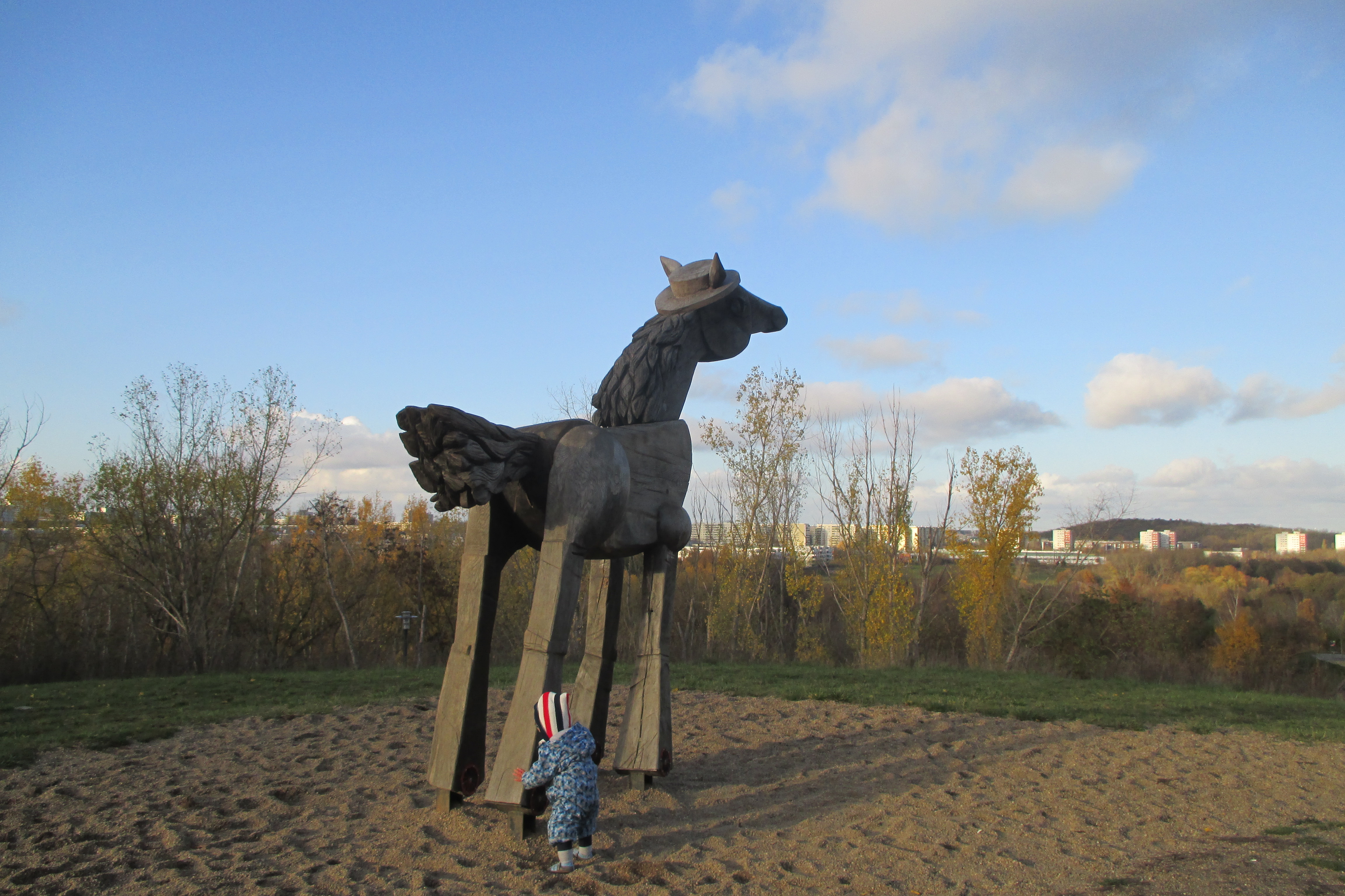 Mittlerweile haben wir die kahle Hochhaussiedlung erreicht, nachdem wir durch den Landschaftspark am Gehrensee gelaufen sind. Doch wer hier ein größeres, seeähnliches Gewässer erwartet, wird enttäuscht. Immerhin gibt es die nach dem See benannte Gehrenseestraße, die wiederum einem S-Bahnhof ihren Namen gab. Doch von einem richtigen See ist wenig zu sehen, einzig zwischen den Röhrichten blinken kleine offene Wasserflächen auf. Wir ziehen also weiter, passieren das Neubaugebiet, laufen zur Ahrensfelder Chaussee und queren die Bahngleise am Bahnhof Ahrensfelde. Weiter geht es über die Havemannstraße vorbei an Plattenbauten, Fressbuden und der Poliklinik mit Regenbogenpferd – letzteres ein farbenfroher Lichtblick im Kiez. Es ist nicht die Idylle, die ich von dem bisherigen Rundwanderweg gewohnt bin. Aber auch das ist ein Stück Berlin. Und auch hier lässt der Kontrast nicht lange auf sich warten. Bereits aus der Ferne erspähen wir den Wuhletalwächter und betreten auf dem markierten Wuhletalweg begrünten Stadtpark. Am Wächter sind einige Kletterer am Werk – ein bisschen schauen wir zu, dann ziehen wir Richtung Ahrensfelder Berge weiter. Dort marschieren wir auf steilem Pfad die Anhöhe hinauf. Um ehrlich zu sein ist der Anstieg für Berlins „alpine Verhältnisse“ sogar ganz schön steil!