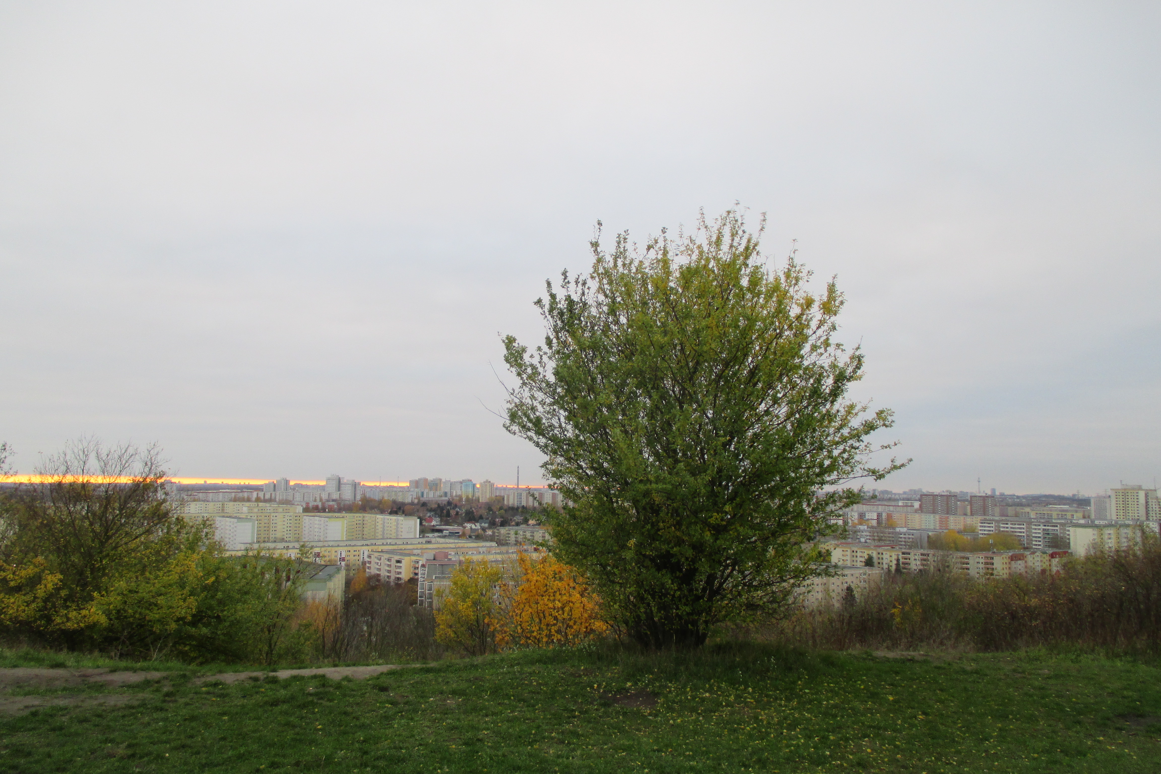 Oben angekommen, sind wir versöhnt. Das 360 Grad Panorama vom Großen Ahrensfelder Berg auf 112,1 Metern Höhe hat es in sich! Weit fällt unser Blick auf die Neubausiedlungen, dazwischen immer wieder grün. Die Sicht führt sowohl Richtung Innenstadt, als auch nach Brandenburg. Die Zeit spielt ebenso mit und taucht das Panorama in ein weiches, warmes Licht. Es ist vielleicht nicht der schönste Ausblick auf die Stadt Berlin – auf jeden Fall aber eine spektakuläre Aussicht, die ich so nicht erwartet hätte. Meine Mama ebenso wenig – und das, obwohl wir in meiner frühen Kindheit keine fünf Kilometer vom Berg gewohnt haben. Auf dem Großen Ahrensfelder Berg sind wir aber nie gewesen. Ich erkenne im Westen sogar das Hochhaus meiner Kindheit. Der Blick schweift weit … da – ganz weit hinten, sieht man heute sogar den Fernsehturm. Ich frage mich, ob es eigentlich einen Ort in Berlin gibt, von dem aus man das Wahrzeichen der Stadt nicht sehen kann? Irgendwie sind Turm und Kugel immer da …