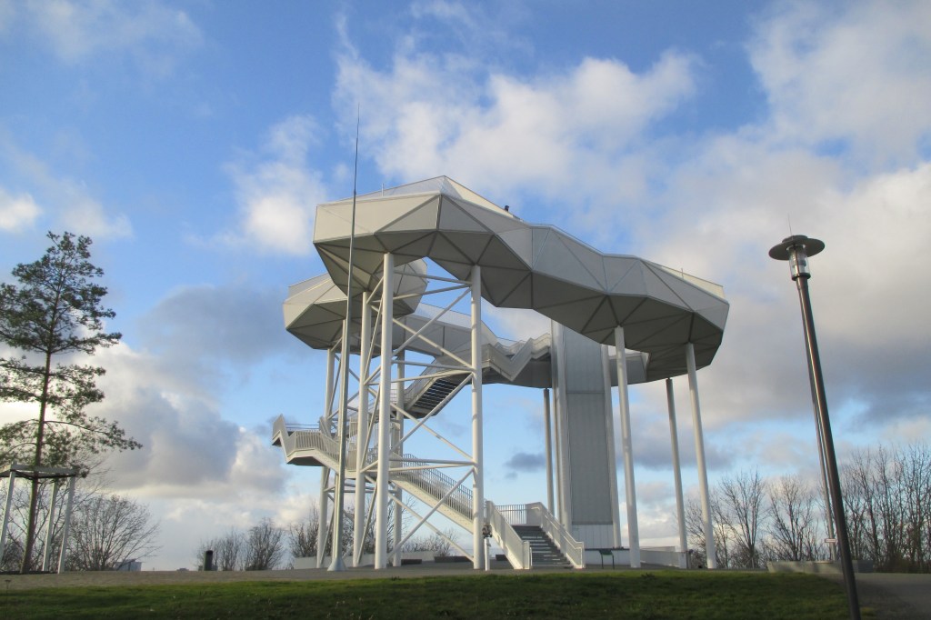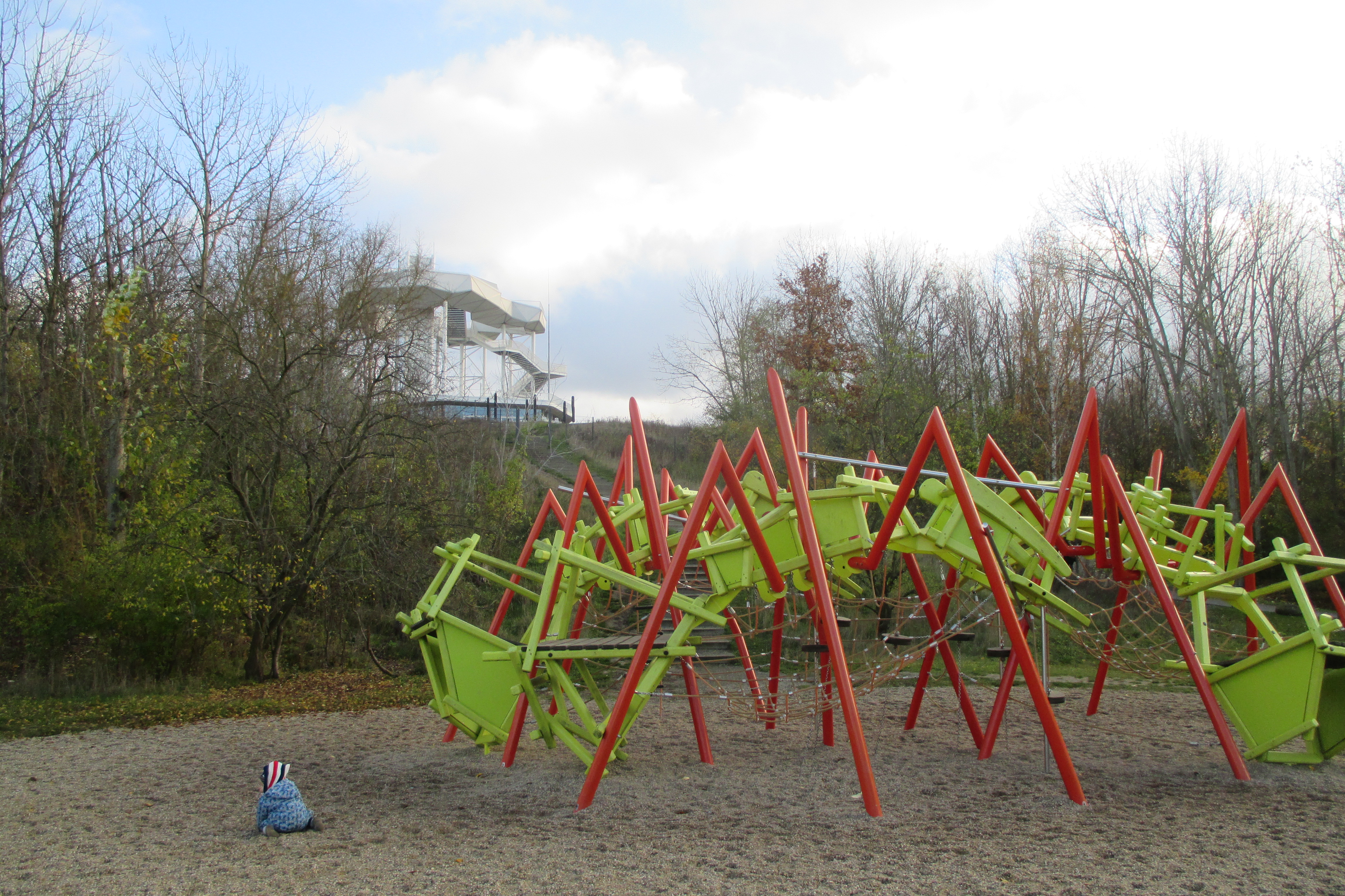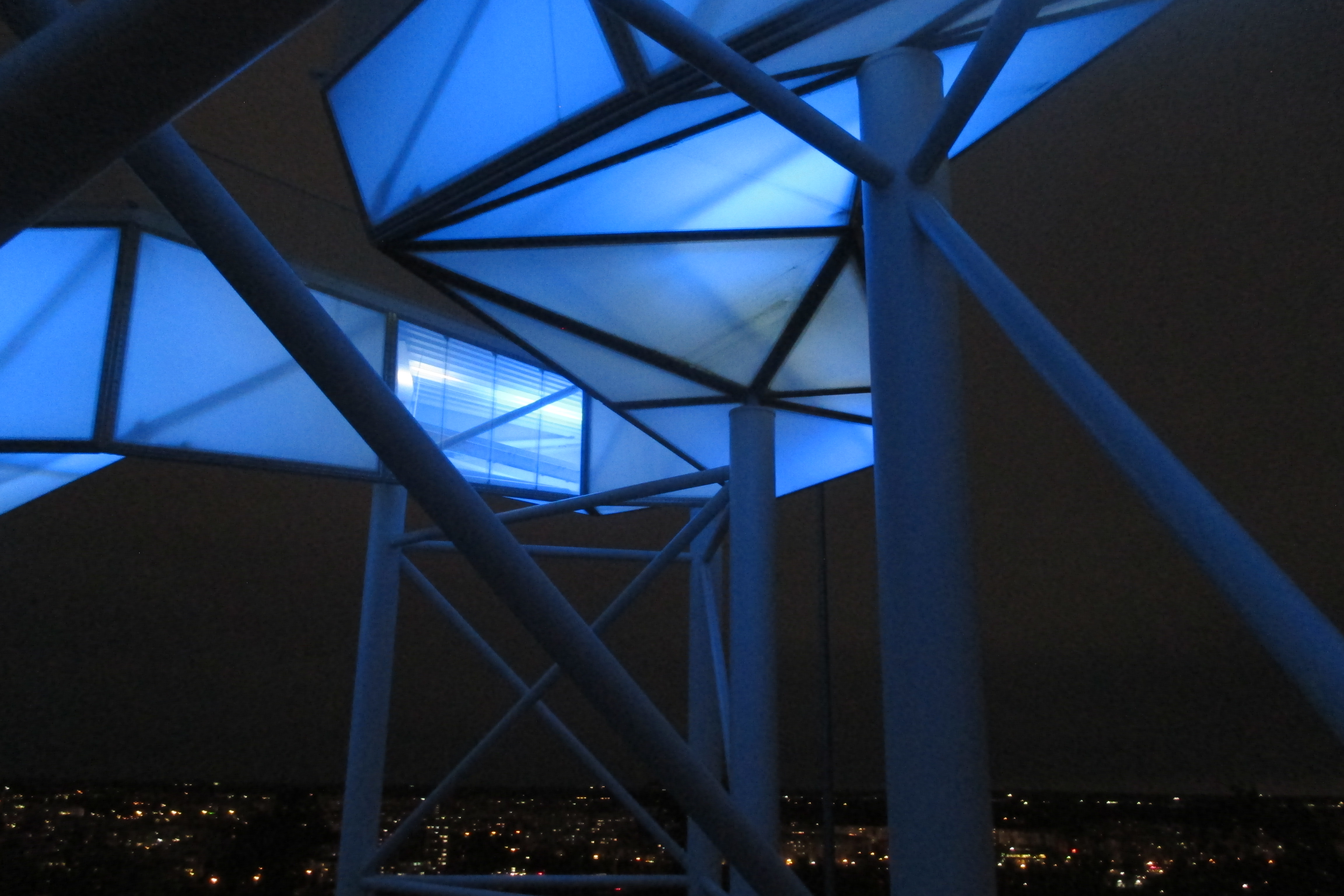 Wir laufen den Ahrensfelder Berg nach Süden hinab. Ebenso steil wie es hoch ging, geht es nun wieder runter. Vorbei geht’s am Fasanenpfuhl, dann queren wir die Landsberger Allee am Betriebshof der BVG und laufen weiter durch den Stadtpark. Die Hochhaus-Silhouette bleibt erhalten. Schließlich erreichen wir das ehemalige BUGA-Gelände, wo wir im Schlängelweg den 102,6 Meter hohen Kienberg mit Aussichtsplattform bezwingen. Natürlich steigen wir auch noch auf den 120 Meter über dem Meeresspiegel stehenden Wolkenhain, der im Rahmen der IGA 2017 gebaut wurde. Der aus 200 Tonnen Stahl bestehende Koloss ermöglicht einen grandiosen Blick über Berlin und ins Brandenburgische hinein. Der Besuch lohnt hier im Übrigen besonders nach der Dämmerung, da die aus einer transluzenten Membran bestehende Wolke von innen heraus Blau leuchtet. Wunderschön. Dass das fetzt, bestätigt übrigens auch mein kleines Söhnchen, das ununterbrochen: „Da, da, da“ kreischt und ganz aus dem Häuschen vom Lichtermeer ist. Wer an dieser Stelle planen sollte nur mal einen kurzen Abstecher hierher zu machen, dem sei gesagt, dass auch Berlins berüchtigte Seilbahn „Gärten der Welt-Berlin“ die Aussichtsplattform „Wolkenhain“ (Anmerk.: Derzeit bis zum 18. Dezember 2020 geschlossen) anfährt.