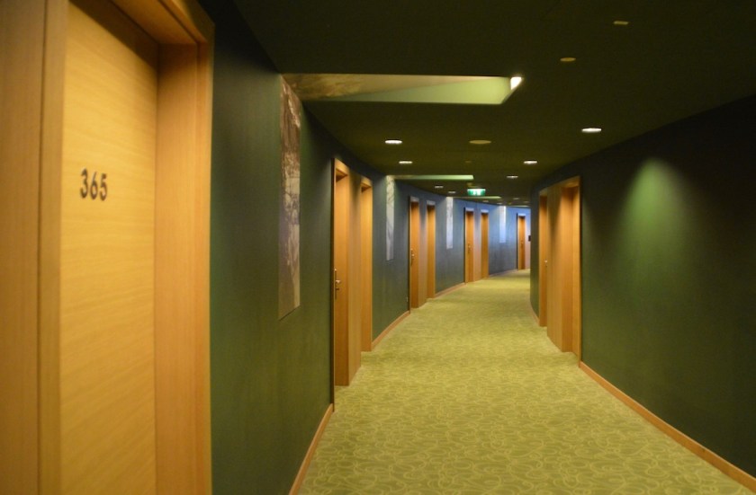 Unser großzügiges Zimmer war im 3. Stock, unweit des Zugangs zum Hotel PanoramaSPA. Der Übergang zur Therme ist auch auf dieser Seite, in dem runden Bau im 1. Stock. Alle 160 Zimmer und Suiten haben einen eigenen Balkon.