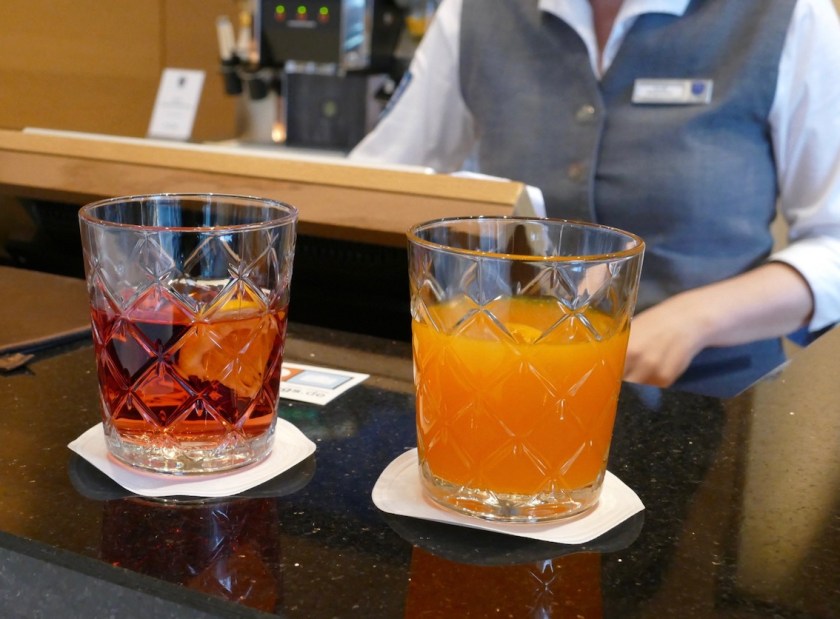 Die Zimmeraufteilung ist gut gewählt. Besonders hat uns das gläserne Badezimmergefallen. Wer es lieber nicht so lichtdurchflutet möchte, kann auch einfach den Vorhang vorziehen. Neben Balkon mit zwei Relaxstühlen, Schreibtisch, Flachbildschirm und Zimmersafe gibt es auch eine Minibar, die täglich mit Sprudel-Wasser, Almdudler und kleinen Säften kostenlos aufgefüllt wird. Wir trinken seit Jahren lieber stilles Wasser, daher unser Wunsch, künftig auch stilles Wasser in der Mini-Bar zur Verfügung zu stellen.