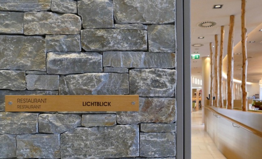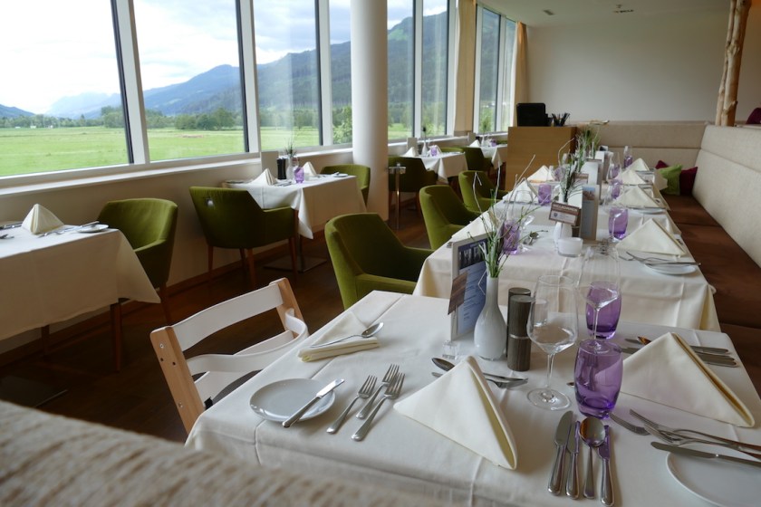Wir wurden zu unserem Tisch begleitet, der auch beim Frühstück für einen reserviert ist und durch ein Namensschild gekennzeichnet ist. Unser Tisch lag zur Sonnenseite und durch die große Glasfront waren wir der Natur draußen wieder ganz nah. Die heutige Speisekarte lag schon parat. Einzelne Gänge werden serviert, bei Salaten und Suppen bedient man sich am vielfältigen Buffet. Hier ein Blick in die Menü-Auswahl Rosa gebratene Barbarieentenbrust an Selleriecreme mit Pak Choi und schwarzem Holler, Filet von der Rotbarbe an Linsen-Kohlrabiragout mit Flusskrebsschwänzen und Pommes Risolee, Gemüse-Süsskartoffel-Strudel oder Faschierte Laibchen vom Kalb.