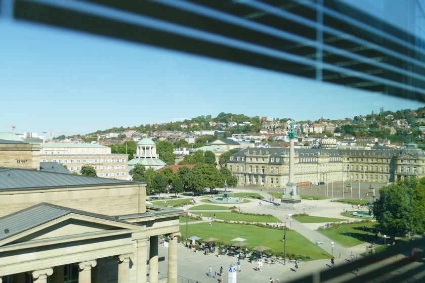 Vorbei am Staatstheater Stuttgart mit Eckensee, neuem Schloss und Stiftskirche.
