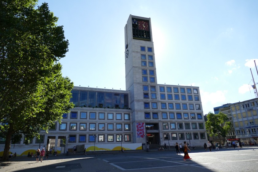 Unübersehbar ist das Rathaus durch den 60,5 Meter hohen Uhrturm. Verlässt man das Rathaus und läuft etwas weiter kommt man in die Geißstraße. In ihrer Mitte steht der „Hans im Glück Brunnen“. Rund um den Brunnen gibt es viele Lokale und Bars die zum chillen oder feiern einladen.