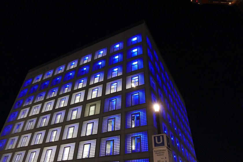 Die Dachterrasse der Stadtbibliothek war leider gesperrt.Nachts ist das Gebäude blau beleuchtet.