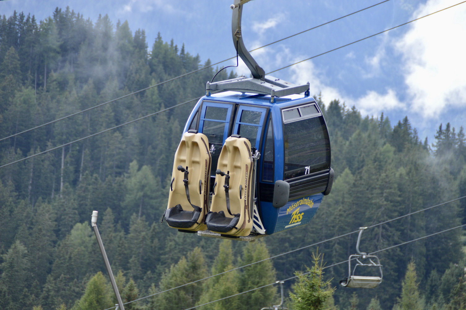 Wir fahren mit der Gondelbahn zum Ausgangspunkt zurück und steigen in die nächste Bergbahn, die Möseralmbahn.