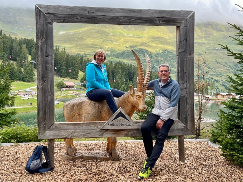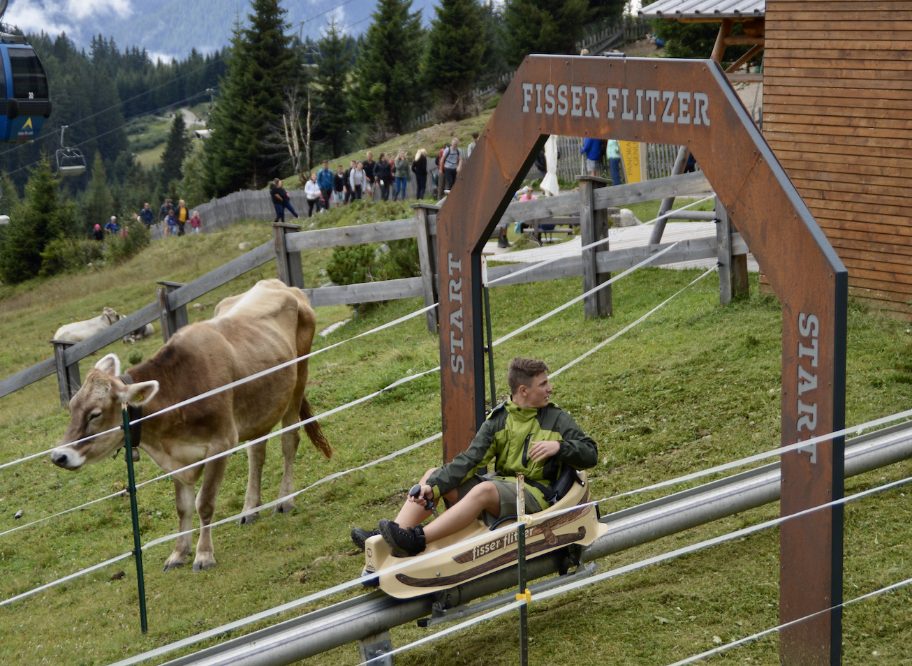 Während der Gondelfahrt nach oben sehen wir schon die kurvenreiche Strecke der Rodelbahn, dem Fisser Flitzer. Die Rodel werden einfach an die Gondeln gehängt und wieder nach oben transportiert. Es gibt also auch hier wieder viele Wege nach unten. Wandern, Gondelbahn oder Fisser Flitzer.