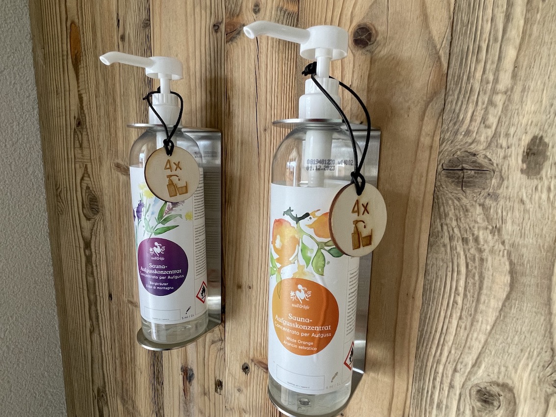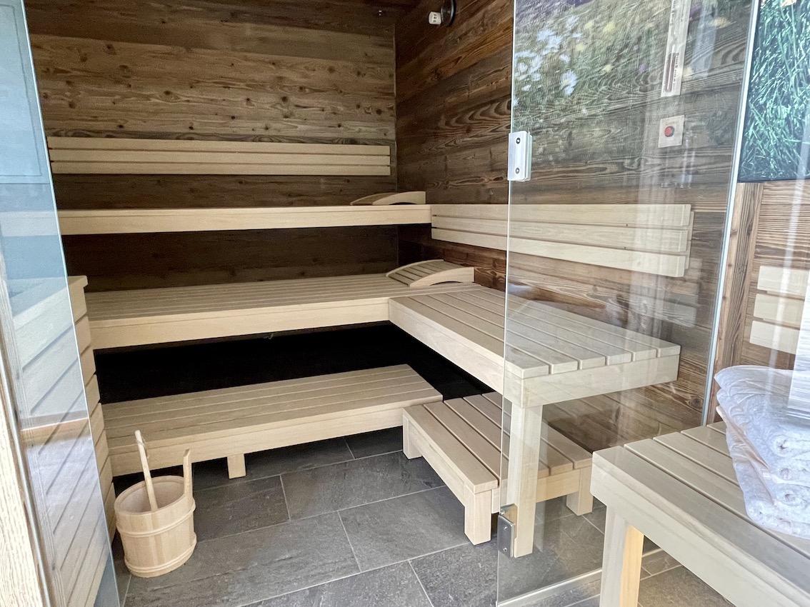 Panorama-Bergblick inklusive. Perfekter Relaxbereich nach einem Outdoortag in den Bergen. Genügend Saunahandtücher sind vorhanden, kuschelige Bademäntel würden es noch perfektionieren.